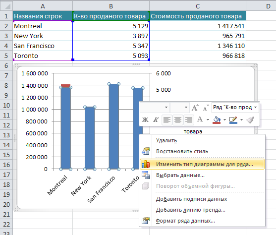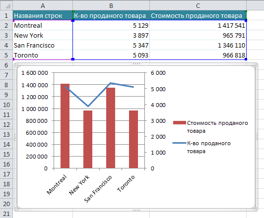 Бачимо, що значення для двох стовпців відображаються зліва. Для коректного відображення "Кількості проданого товару" нам необхідно створити другу вісь.
