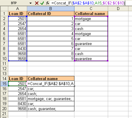 Function CONCATIF(Table As Range, SearchValue As Variant, Table2 As Range) 'moonexcel.com.ua Dim i As Integer For i = 1 To Table.Rows.Count If Table.Cells(i, 1) = SearchValue Then If Not IsEmpty(Table2.Cells(i, 1).Value) Then CONCATIF = CONCATIF & Table2.Cells(i, 1).Value & "; " End If End If Next i CONCATIF = Left(CONCATIF, Len(CONCATIF) - 2) End Function