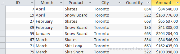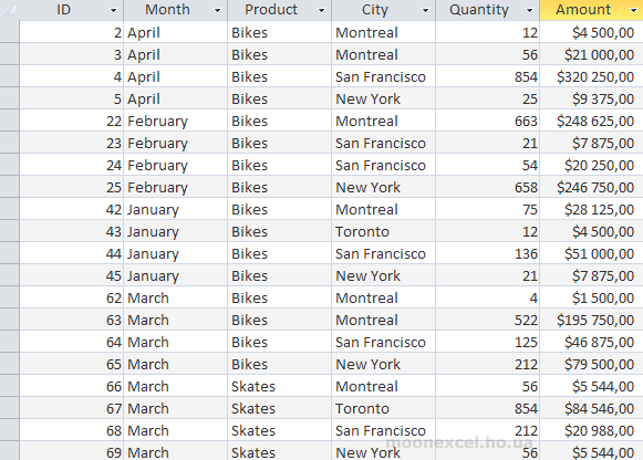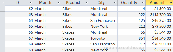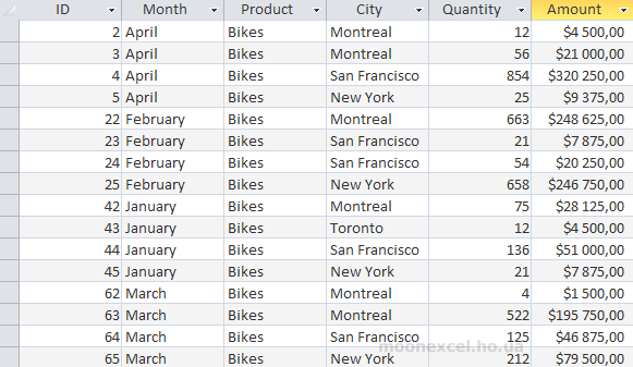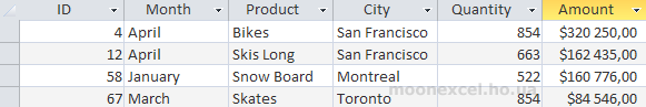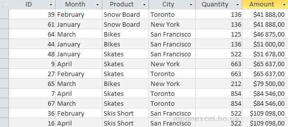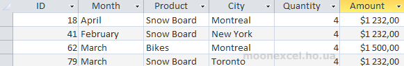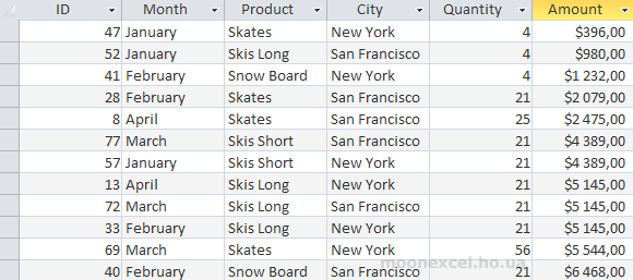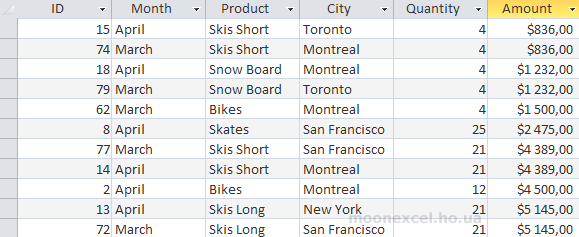 В цьому прикладі ми відібрали записи, в яких виручка від реалізації становила більше 40 тис. $ та, додатково, всі записи посортували по зростанню по полю Amount.