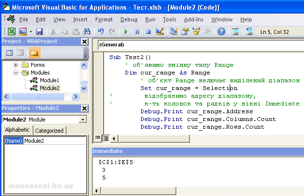 Даним кодом ми присвоїли нашому діапазону cur_range виділені комірки. Далі, за допомогою функції Debug.Print відобразили параметри діапазону у вікні попереднього огляду значень Immediate.