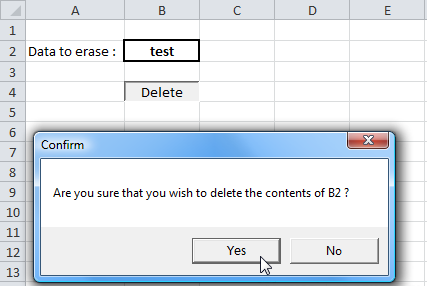 If MsgBox("Are you sure that you wish to delete the contents of B2 ?", vbYesNo, "Confirm") = vbYes