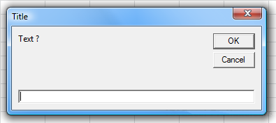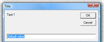 result = InputBox("Text ?", "Title") 'Змінній присвоюється значення, що введене в InputBox