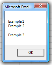 MsgBox "Example 1" & Chr(10) & "Example 2" & Chr(10) & Chr(10) & "Example 3"