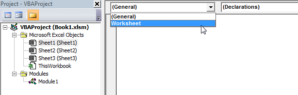 Щоби виконати інструкції, які базуються на подіях для окремого аркуша, виберіть аркуш в редакторі, а потім Worksheet: