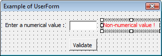 Додайте другий підпис (Label) і відредагуйте наступні властивості: Caption, Forecolor (color : red) та Visible (False, щоби сховати елемент управління по замовчуванню) :