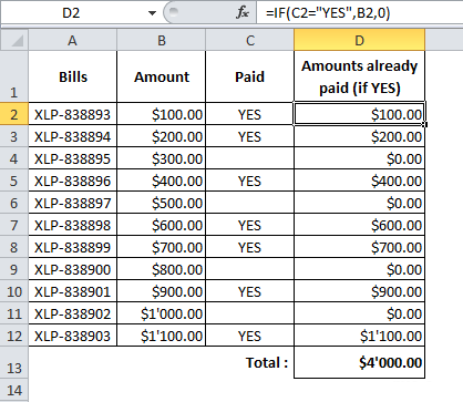 Щоби відобразити значення (B2) якщо комірка (C2) має значення ("YES"), ми могли б використати функцію IF у формулі =IF(C2="YES",B2,0):