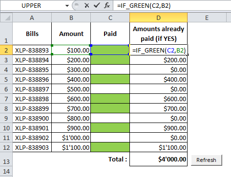 Нашою ціллю в цьому випадку є створення функції, яка б могла робити це =IF(C2 has a green background,B2,0), і яку ми б записали, типу: =IF_GREEN(C2,B2):