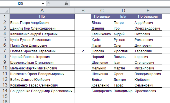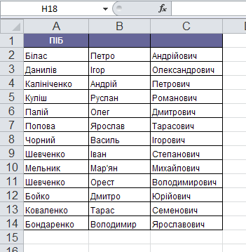 Для прикладу, маємо стовпець із назвами клієнтів, який потрібно розділити на кілька окремих стовпців (щоби окремо було "Прізвище", "Ім'я", "По-батькові").