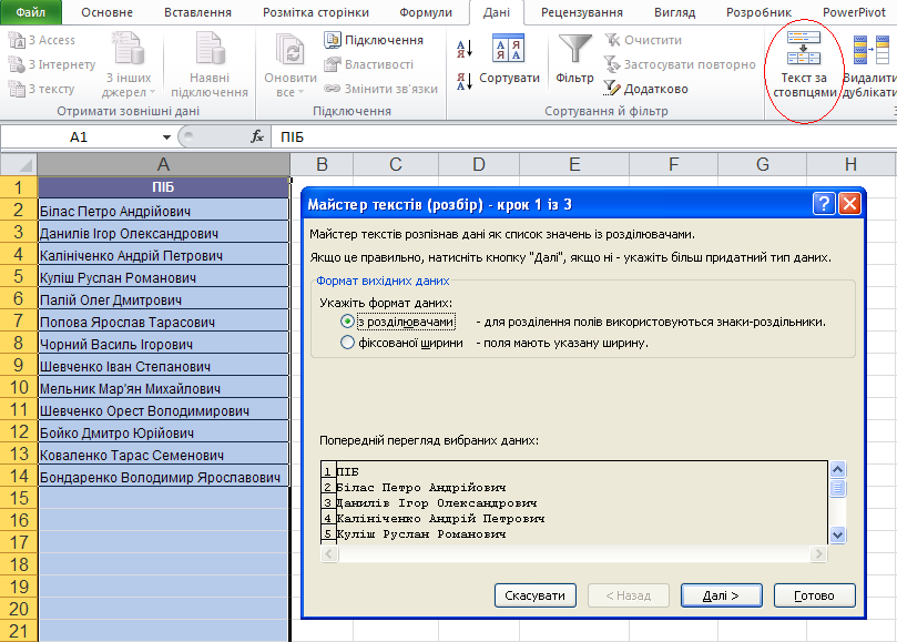 Для цього, виділіть клітинки, які будемо розбивати та виберіть у меню Дані - Текст за стовпцями (Data - Text to columns). З'явиться вікно Майстра текстів (Text Wizard):