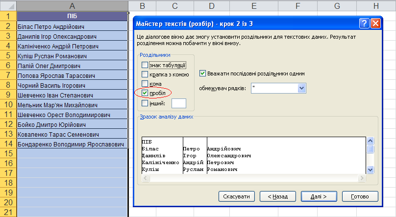 На другому кроці Майстра, оскільки ми вибрали формат з розділювачами, то нам необхідно вказати, який саме символ є розділювачем (в нашому випадку "пробіл"):