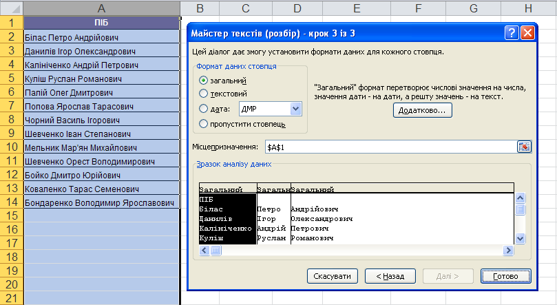 І, нарешті, на третьому кроці для кожного з одержаних стовпців, виділяючи їх попередньо у вікні Майстра, необхідно вибрати формат: