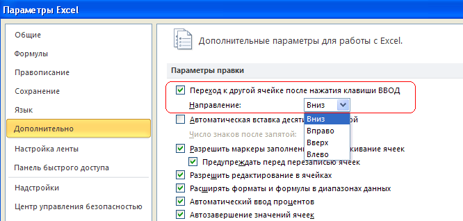 Excel'de mevcut hücrenin işaretçisinin hareket sırasını standarttan diğerine değiştirebileceğiniz ortaya çıktı. Bunu yapmak için menüyü seçin Dosya - Seçenekler - Gelişmiş ve "Düzenleme seçenekleri" imleç hareketinin başka bir yönünü seçelim: