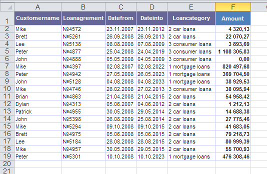 Припустимо, у нас є ось така таблиця оформлених кредитів: