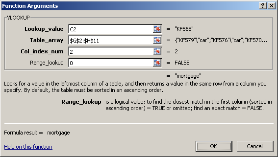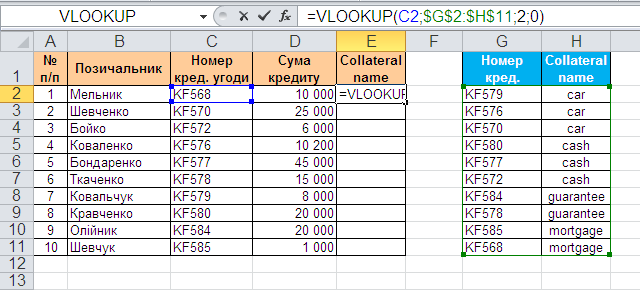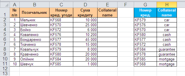 В Excel в стандартоному наборі функцій в категорії Lookup and reference є функція VLOOKUP. Ця функія шукає вказане значення (в нашому прикладі номер угоди) в крайній лівій колонці зазначеної таблиці (таблиці забезпечення) рухаючись з гори до низу та, знаходячи їх, відображає значення сусідньої комірки (тип забезпечення по кредиту). Схематично робота функції виглядає так: