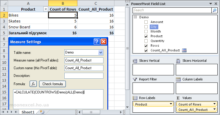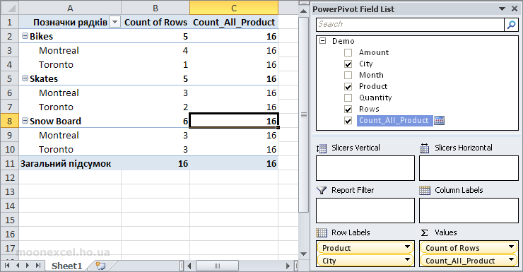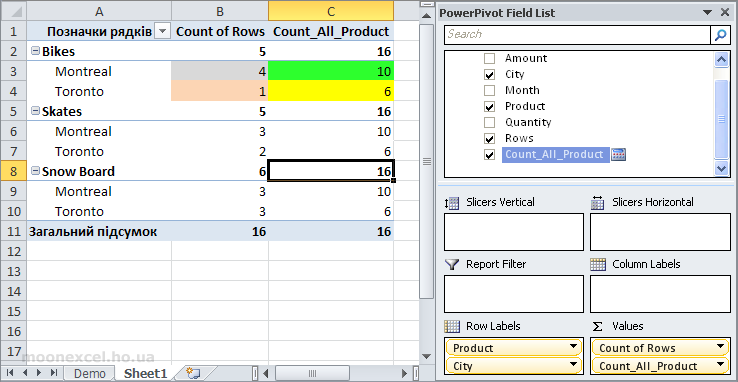 Яким чином ми отримали в розрахунковому полі Count_All_Product цифри 16? Пояснення в тому, що ми зняли для цього поля всі фільтри, які були застосовані в зведеній таблиці (кожен рядок в зведеній таблиці це є окремий фільтр), за допомогою функції ALL(). Тобто, інакше кажучи, функція ALL (